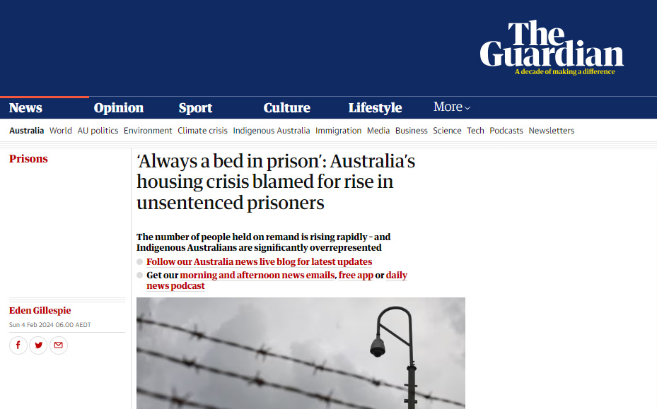 Last week, Guardian Australia reported on how the housing crisis is affecting the rising numbers of people who are incarcerated on remand, and those who cannot find stable housing after exiting prison.